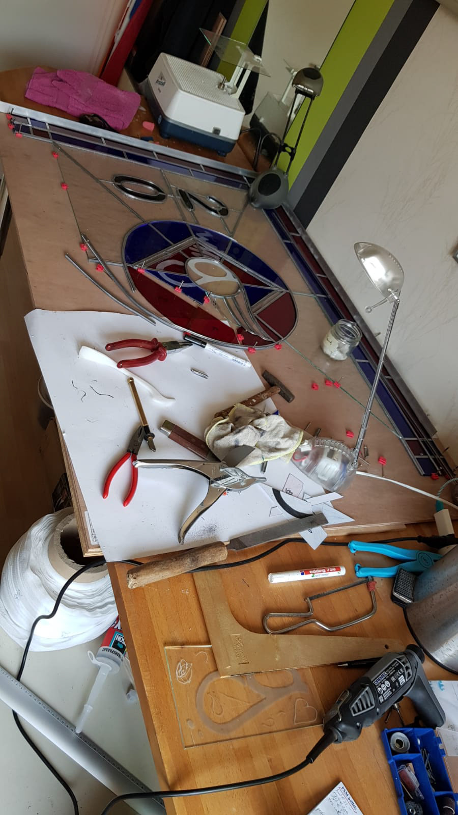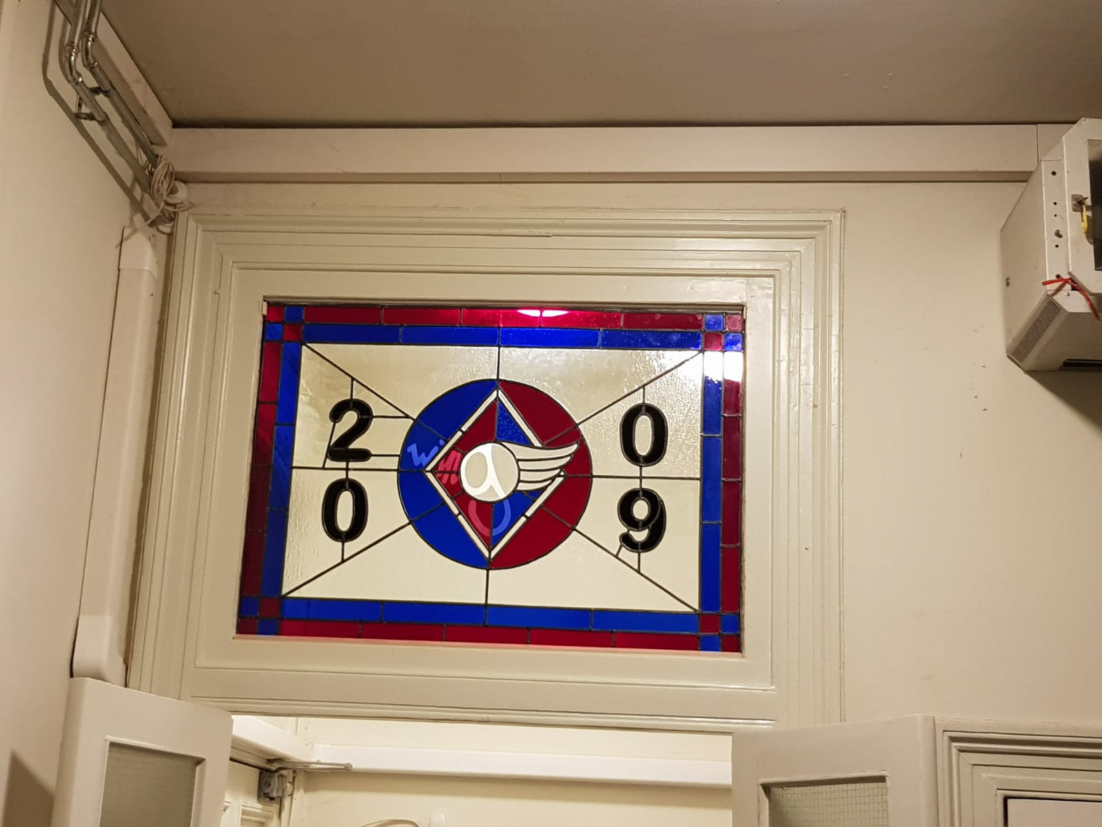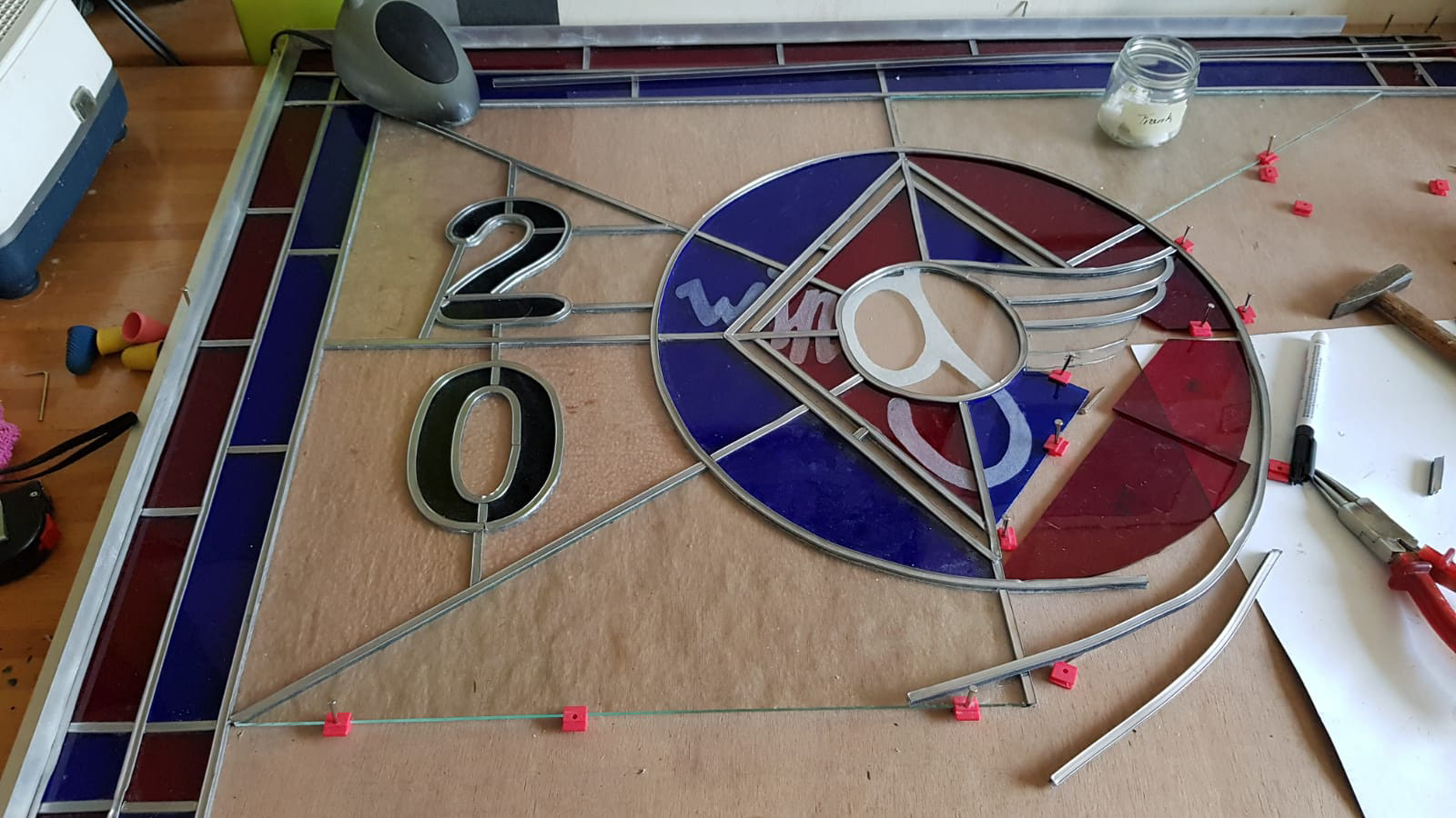 Voor een studentenvereniging in Nijmegen, ben ik gevraagd om een glas in lood ontwerp te maken, wat als afscheidscadeau aan 'het huis' gegeven zou worden. De groep van de studentenvereniging hadden al een logo, wat ik heb verwerkt in het ontwerp.